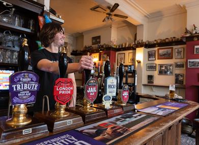 It serves a selection of locally-sourced real ales, ciders and premium lagers, as well as spirits, wines and sparkling wines and an extensive selection of gin.